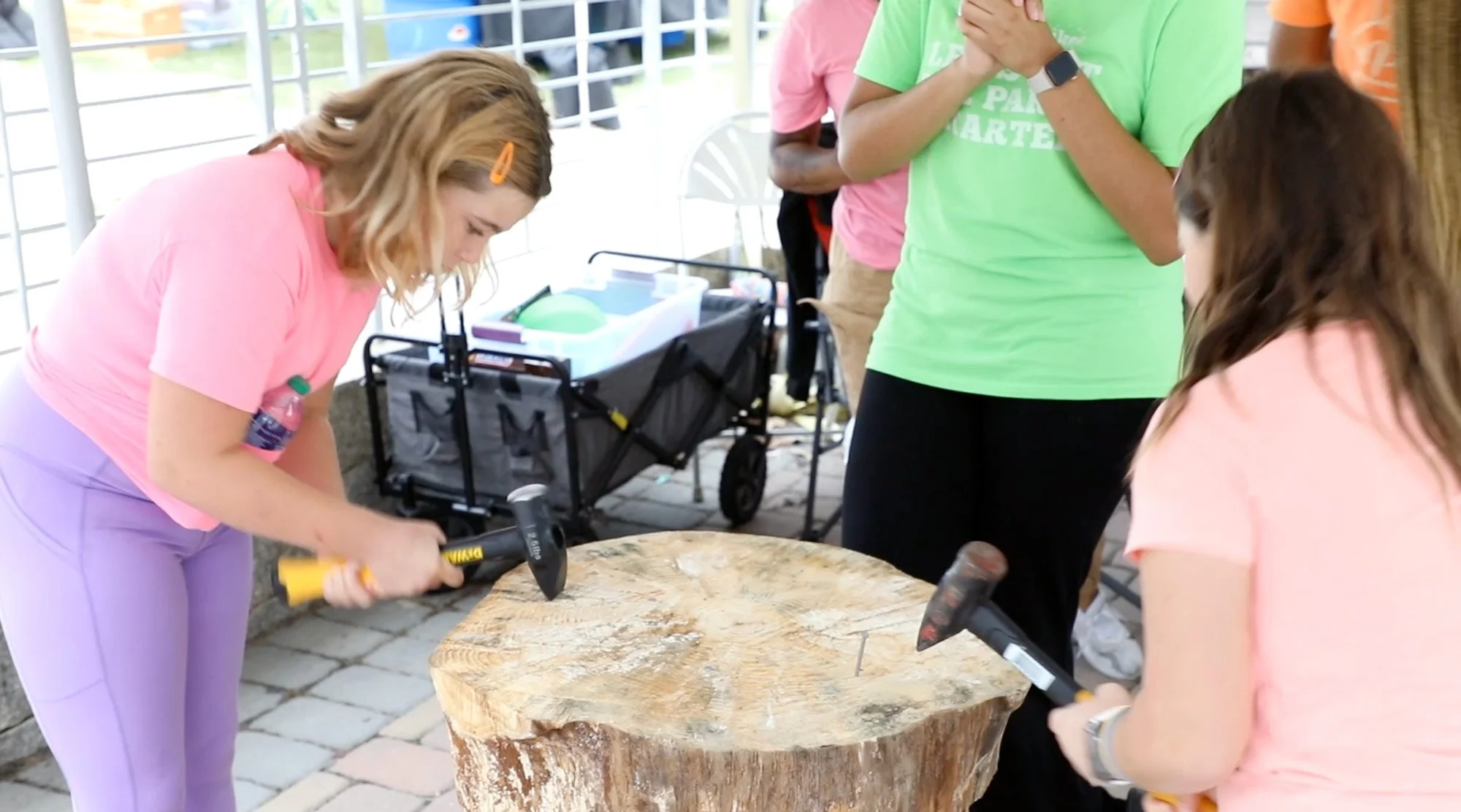 Schlagen Hammern, also known as "Stump" or "Nagelbalken" (German for "nail beam"), is a game where participants compete to drive nails into a large stump of wooden, often played at events like Oktoberfest. It’s an all-day activity that you and your group can play for fun. There are no prizes for winners, just bragging rights for winning this tradition!